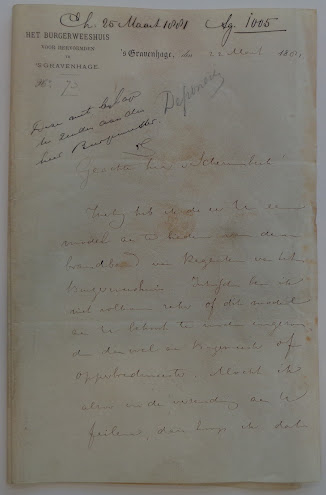 DEN HAAG – Het komt niet zo heel vaak voor, maar als het gebeurt, wakkert het de nieuwsgierigheid bovenmatig aan. Zo ook na het inkijken van doos 4501 uit 1881 bij het Haags Gemeentearchief. Nog maar net bezig met het ontleden van de opgeborgen papieren uit dat jaar komt er plotseling een enigszins verkleurde en versleten leren band tevoorschijn, groot genoeg om aan de pols te dragen. Het is giswerk vast te stellen wanneer hij is ondergebracht bij serienummer 0353-01, maar voor de hand ligt, dat dit is gebeurd bij een opruimactie. In dit geval bij het Burgerweeshuis voor Hervormden, die deze ‘brandband’ mogelijk begin twintigste eeuw, bij de verhuizing van het Westeinde naar het Jozef Israëlsplein, bij het Haags Gemeentearchief heeft achtergelaten.